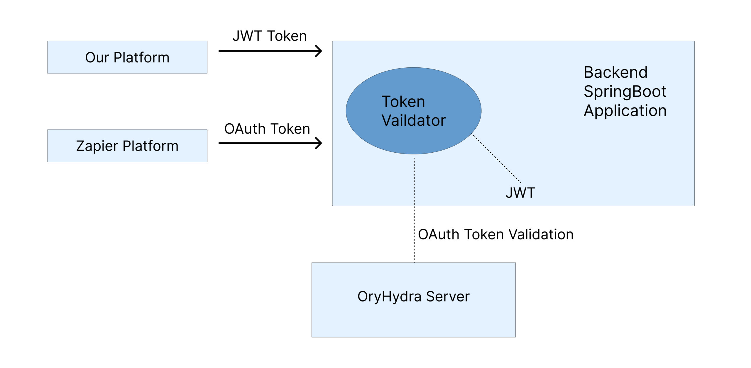When a request arrives, the backend determines whether the token should be validated against Hydra (via token introspection) or validated using our existing JWT verifier. This allows the same API endpoints to be accessed securely by both Zapier and our internal frontend.
