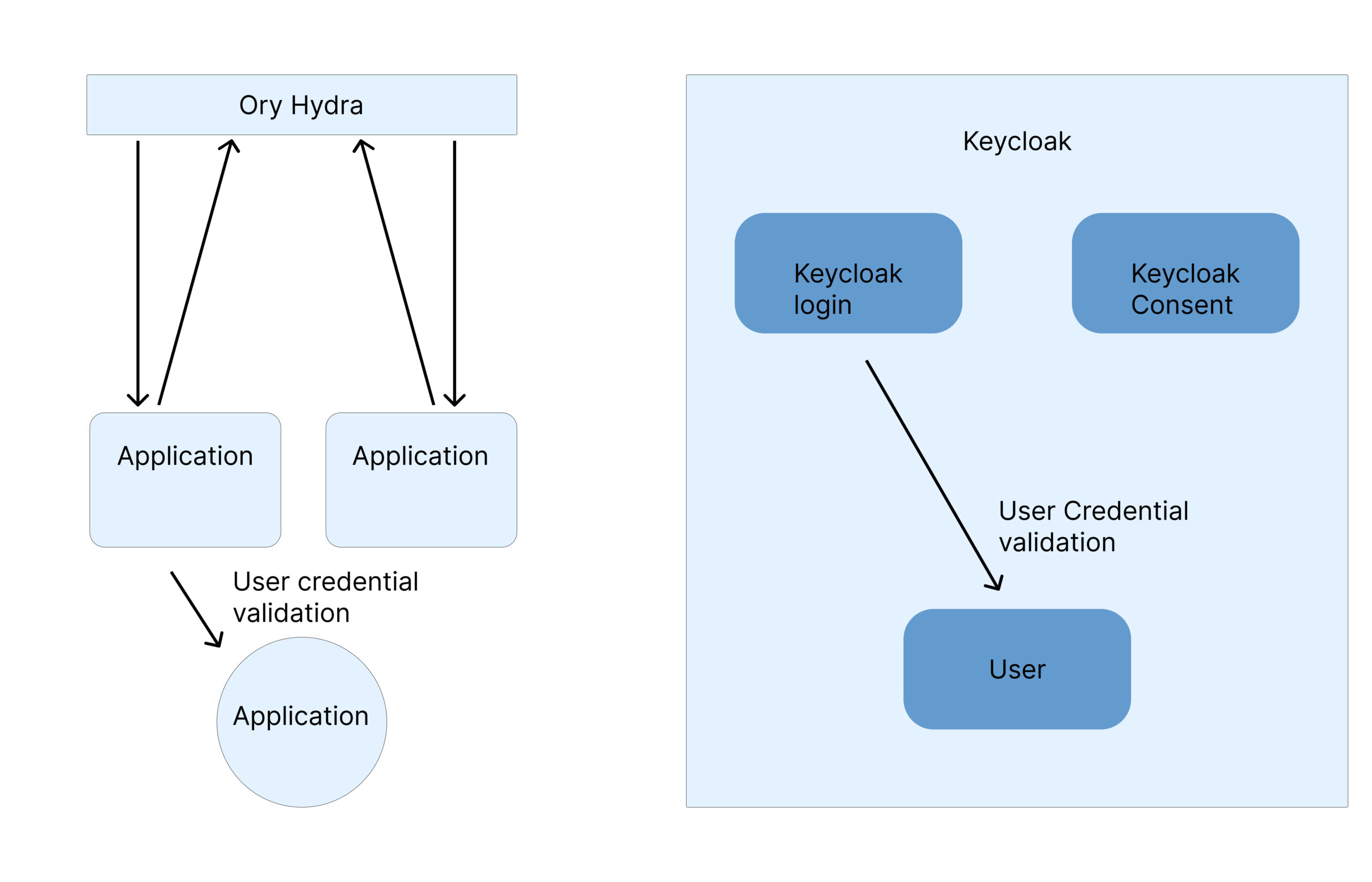 • Keycloak has its own login and consent page, whereas in Ory Hydra, you just need to configure your own login consent URLs